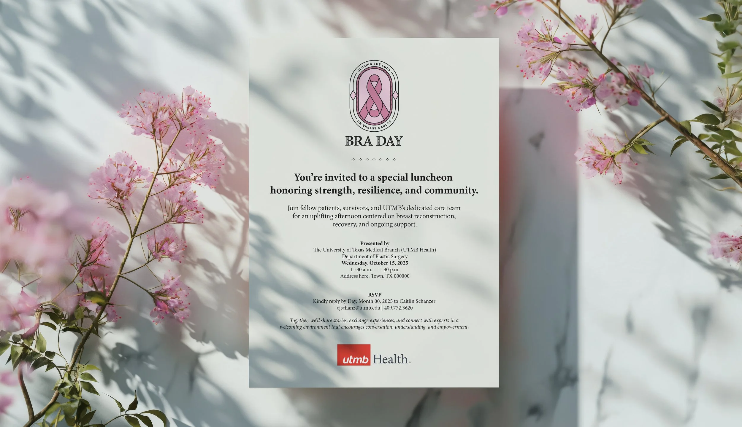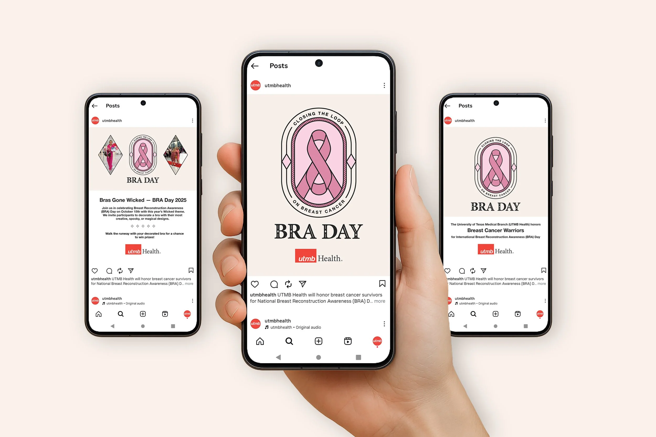 Each year during Breast Cancer Awareness Month, UTMB Health hosts BRA Day, an event to celebrate International Breast Reconstruction Awareness (BRA) Day, a nationally recognized initiative dedicated to empowering individuals affected by breast cancer through education, support, and connection. For BRA Day 2025, I designed the emblem and visual identity for the event, along with the digital and print pieces to support the promotion and environment of the event.